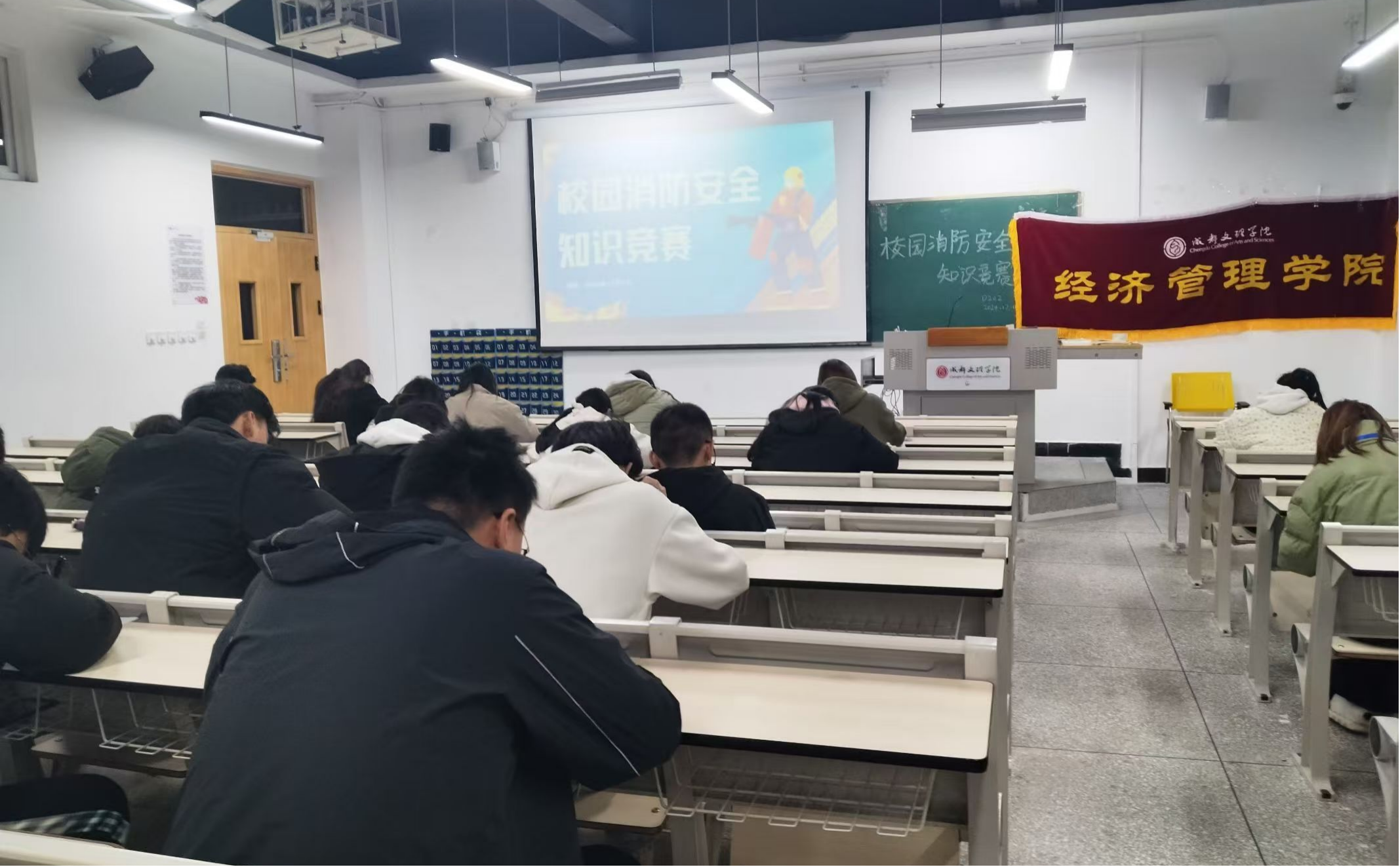 为增强学生的消防安全意识,提高火灾预防和应急处理能力,经济管理学院自管委于12月1日晚18点在主教学楼D栋202举办“校园消防安全知识竞赛”活动。学院报名学生都准时到达竞赛场地参加此次活动,自管委干事负责维系现场秩序。