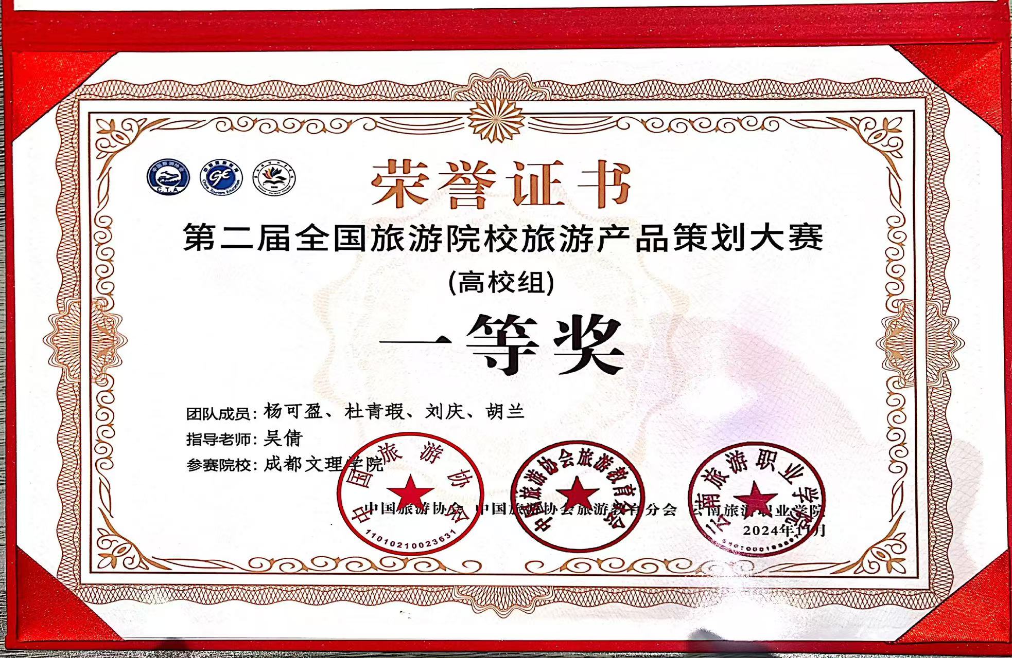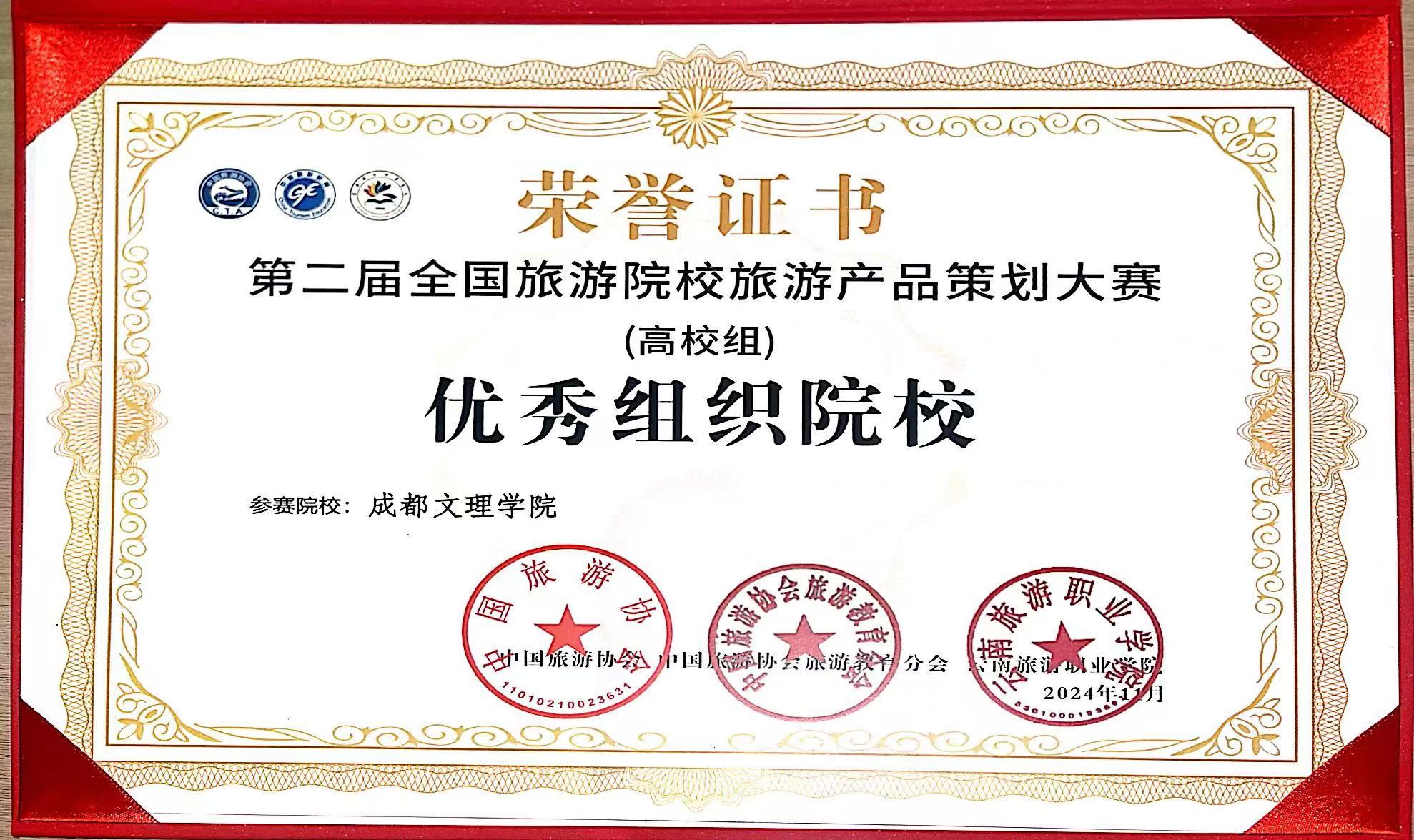 2024年11月14日-16日,由中国旅游协会旅游教育分会举办的第二届全国旅游院校旅游产品策划大赛,在云南旅游职业学院举行。我校经济管理学院吴倩老师指导旅游管理专业杨可盈、杜青瑕、刘庆、胡兰四位同学获得了本次大赛高校组全国一等奖,成都文理学院获得了高校组“优秀组织院校”称号。