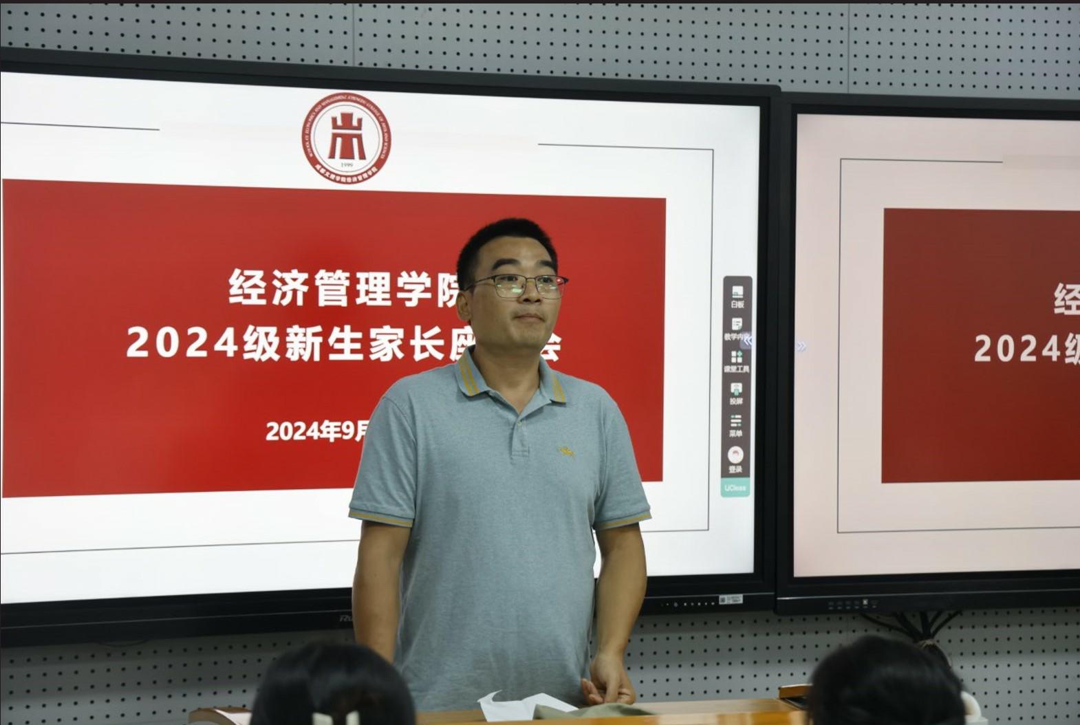 为搭建家校沟通桥梁,共同促进新生适应大学生活,实现家校共育的目标。经济管理学院于9月13日14:30在C104举办新生家长座谈会。经济管理学院常务副院长(主持工作)李瑞强、党总支书记李江、副院长程庆、学工办主任刘婷、新生辅导员张琼及新生家长参会。