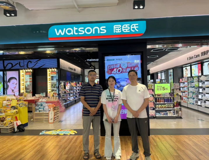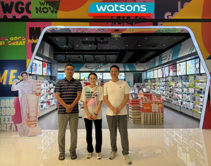 在商圈经理李丹的带领下,石玉峰、张晶宇一行参观了屈臣氏在成都市区的晶融汇广场店和春熙路群光店,实地了解实习学生的工作环境、工作内容。 几位实习学生所展示的工作态度和职业素养,获得了屈臣氏店长、领导的一致认可。