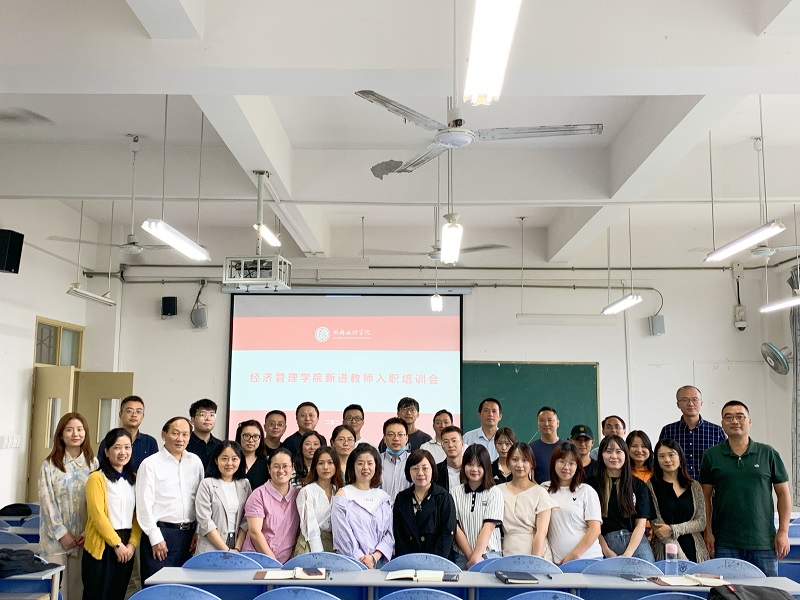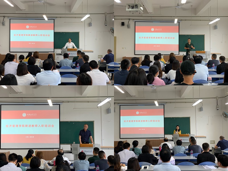 8月26日上午10时,经济管理学院于行政楼D302室开展了2021年新进教师培训会,学院院长蒋和胜,党总支书记李江,副院长李瑞强、程庆出席,学工办主任刘婷、各教研室主任以及全体新进教师参会。