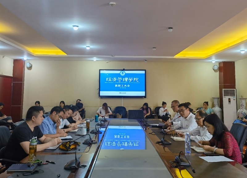6月10日13:30,经济管理学院于第二会议室召开全院教职工大会。经济管理学院院长蒋和胜,党总支书记李江,副院长李瑞强、程庆出席会议,全院教职员工到场参加。