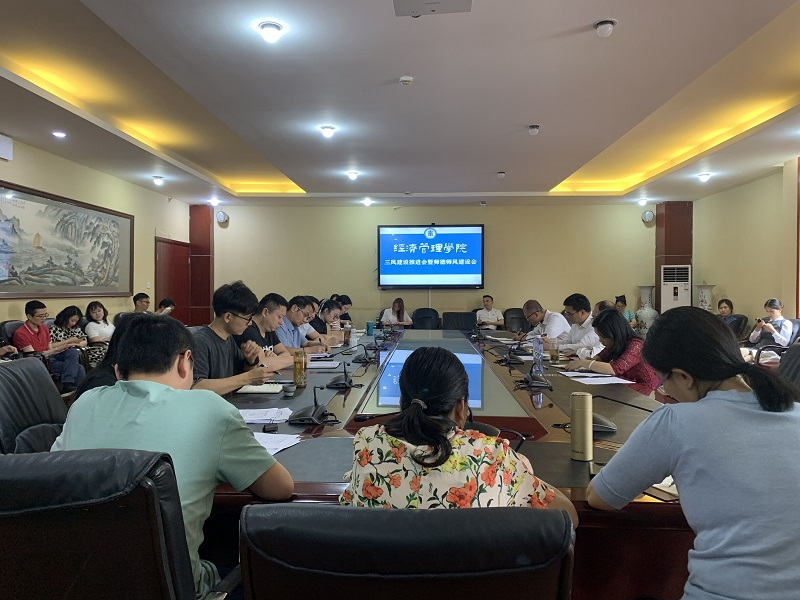 6月10日14:20,经济管理学院于第二会议室召开了三风建设推进会暨师德师风建设会,经济管理学院院长蒋和胜,党总支书记李江,副院长李瑞强、程庆出席会议,全院教职员工到场参加。