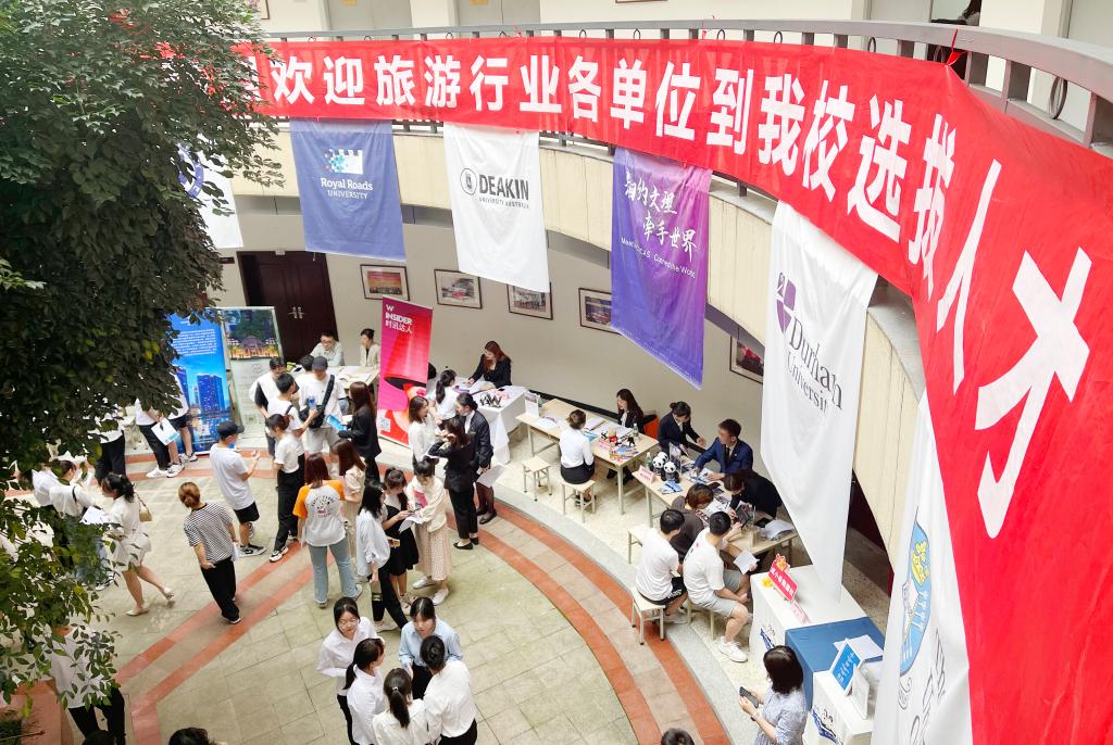 本次招聘会共吸引全球通国际旅行社股份有限公司、香格里拉大酒店(成都)有限公司等18家单位,主要以旅游行业及酒店行业人才招聘为主。招聘单位以海报、传单等形式展示了公司信息、招聘职位、福利薪酬等信息。招聘现场秩序井然,同学们积极与招聘人员交流沟通,主动了解招聘信息,寻求自己心仪的岗位;应聘者们身着正装,准备充分,展现了他们良好的专业素养和沟通交流能力。各企业招聘负责人通过面对面交流的方式对岗位需求、晋升机会等方面进行了详细讲解。在场辅导员们也以个人的经验和专业知识为毕业生们提出建议,帮助他们更好地找到属适合自己的工作岗位。