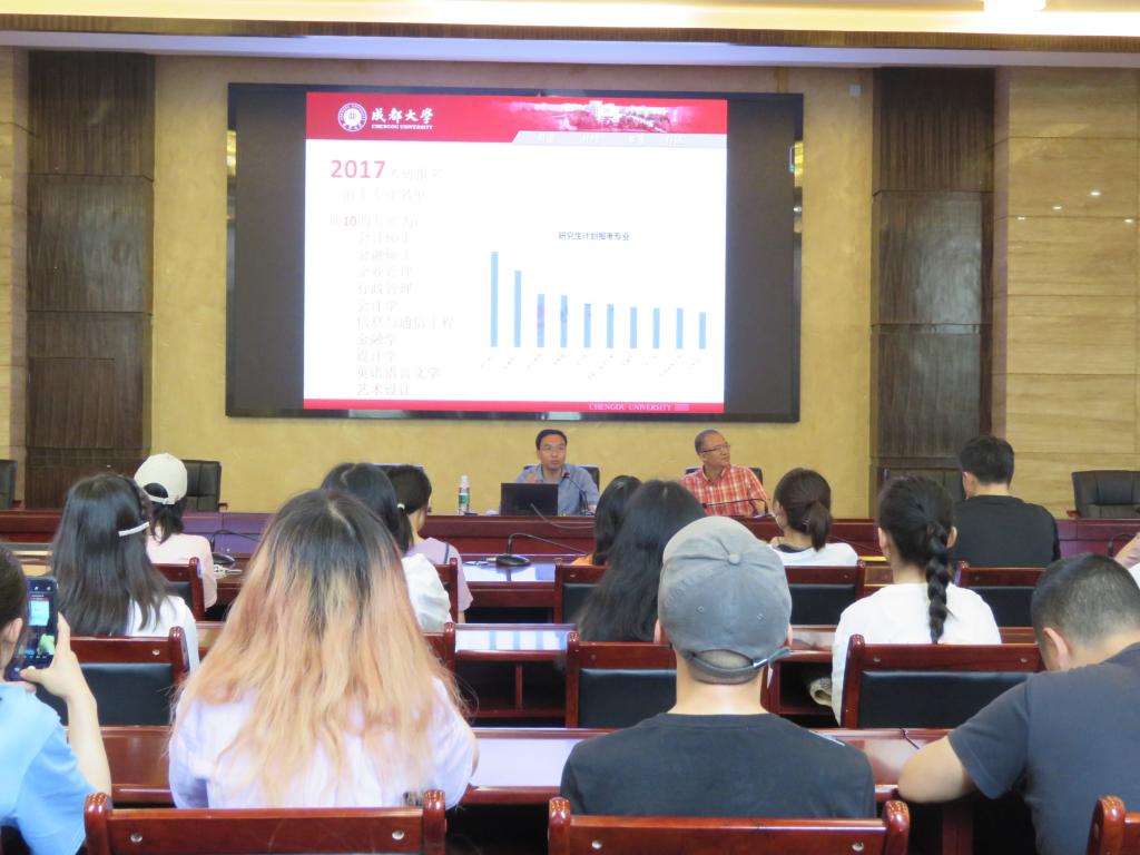 张千友教授以我校优秀毕业生考研案例出发,从调剂机会、学习费用、就业难易度及社会认可度等多个方面解读了学术硕士与专业硕士的区别;结合历年数据,客观分析了考研宏观形势及目标院校及研究方向选择的重要性,对研究生报考及录取政策进行详细解读,为在场学生的考研路指明了方向。同时,他告诫同学们要准确评估自身、慎重选择目标、持续付诸努力、灵活运用资源。最后,他详细介绍了成都大学商学院研究生报考情况,并鼓励大家积极报考。