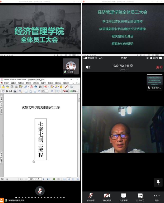 6月3日20时30分,经济管理学院线上召开了全院教职工大会,旨在传达全省民办高校党委书记会议相关精神,贯彻落实疫情防控和返校复学安全稳定相关工作。学院院长蒋和胜、党总支书记李江、副院长程庆、副院长李瑞强、各教研室主任(含副主任)、学院教学秘书及全院辅导员参加会议。本次会议由李瑞强主持。