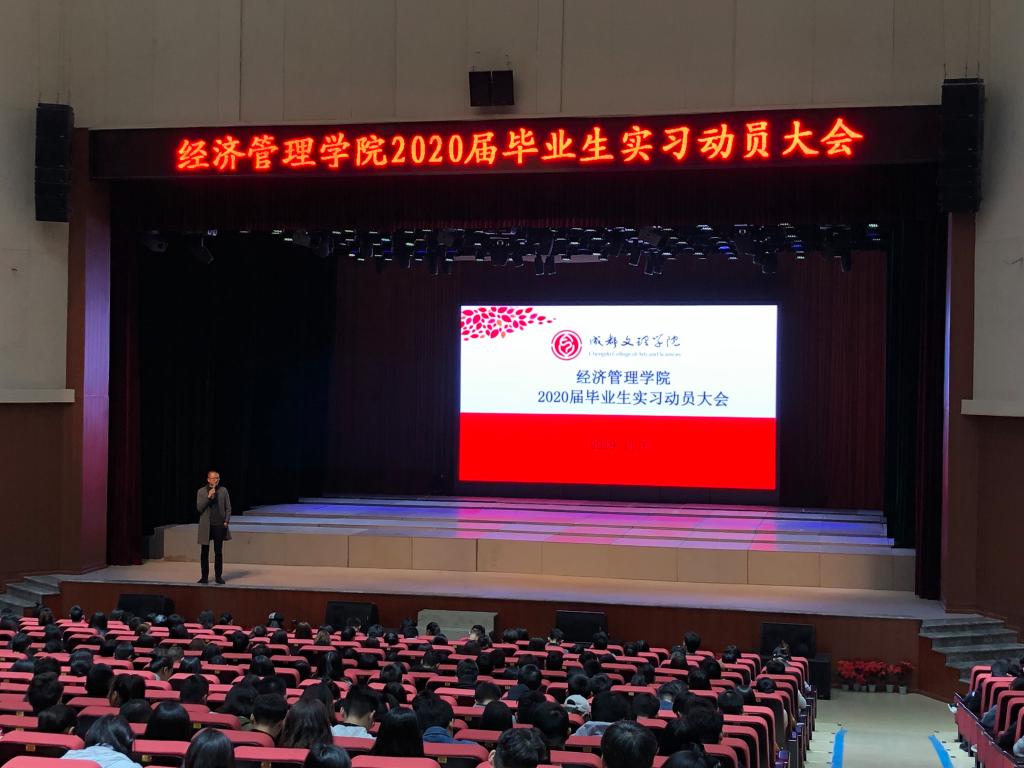 11月6日12:30,经济管理学院于星空剧场召开了2020届毕业生实习动员大会。经济管理学院党总支书记李江、副院长李瑞强、学工办主任周俊霞、全院辅导员、教学秘书罗道文、工商管理教研室主任李映辉及我院2020届全体毕业生到场参加。
