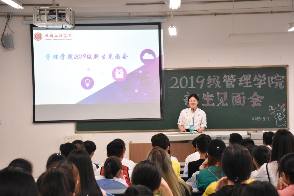 9月3日12:20,学院在主教学楼D114成功举办2019级新生开学典礼。管理学院党总支书记袁久斌、副院长程庆出席,全院教职员工及全院新生到场参加。程庆首先对全体新生表示热烈欢迎,介绍了应用型人才培养模式、学校的国际化平台、学院的育人体系、师资力量,同时,对新生提出了志存高远、脚踏实地、具有家国情怀的希望。教师代表石玉峰表示,希望新生在大学合理规划大学生活、学会做人、学会做事。老生代表蒋良宇以自己的个人经历激励新生。新生代表龙雨欣代表全体新生表达了对老师的感谢,以及对未来大学生活的向往。随后的专业介绍会上,李映辉和刘飞两位老师分别介绍了管理学院各专业的教育教学情况及各专业的就业前景。