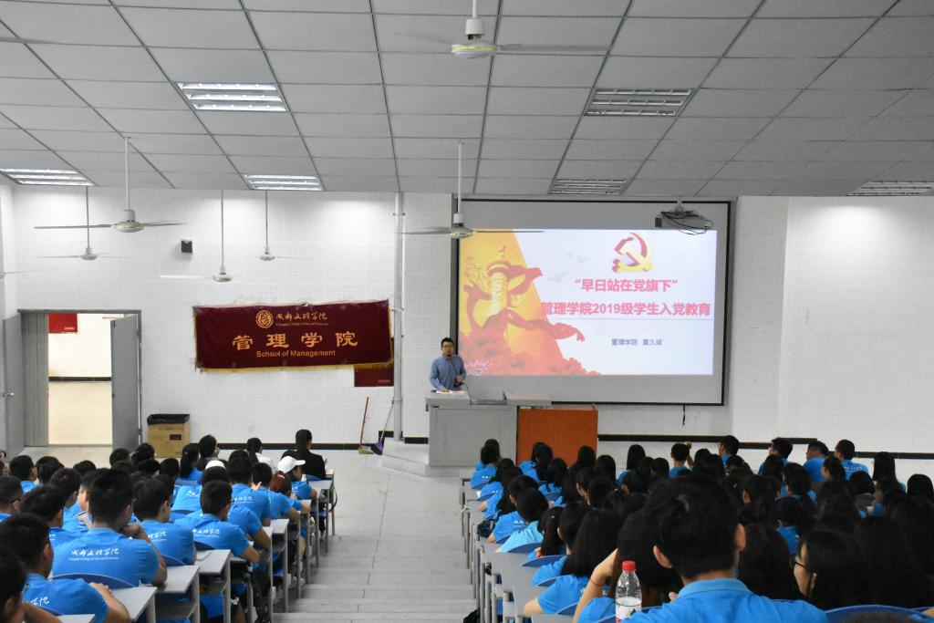 9月3日上午,学院召开了“早日站在党旗下”专题辅导及“我的入党历程”分享会。管理学院党总支书记袁久斌、2019级辅导员阮如玉、刘楠出席会议,学生党员代表何菊、唐斯到场作分享,学院2019级全体新生到场参加。袁久斌强调四个“要”:一是要相信中国共产党是一个能带领国家强起来、人民富起来的党;二是要知道青年的成长离不开党,加入中国共产党是大学生的最佳政治选择;三是要积极向党组织靠拢,树立正确的入党动机;四是要消除思想误区,提出入党申请,接受系统培养教育。学生党员代表则着重从对党的认识、入党的心路历程与自身蜕变、个人启示与建议来鼓励新同学端正入党动机、合理规划发展、全面提升自己,使自己早日站在党旗下。