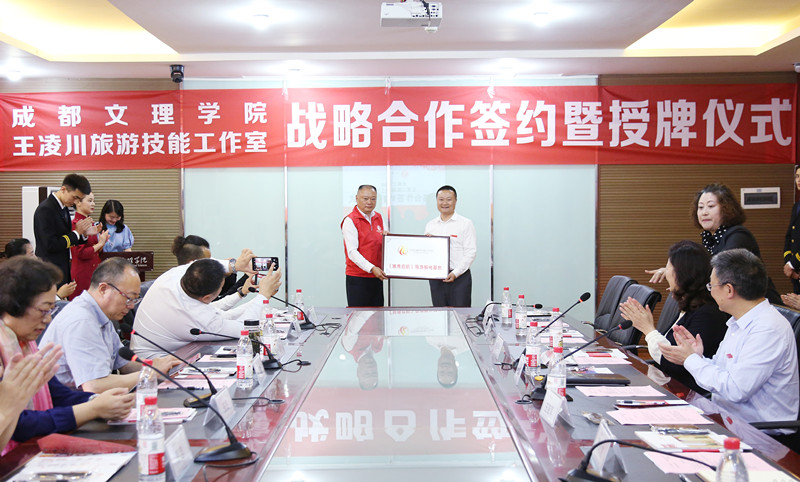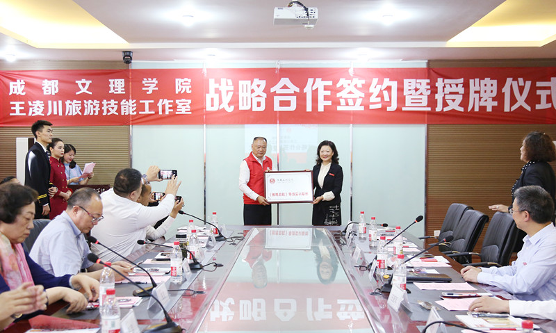 唐小林代表我校与王凌川旅游技能工作室正式签订协议,高华锦代表我校与王凌川旅游技能工作室举行授牌仪式。(记者 王海郦 曹正奇 王帅韬 范莞欣)