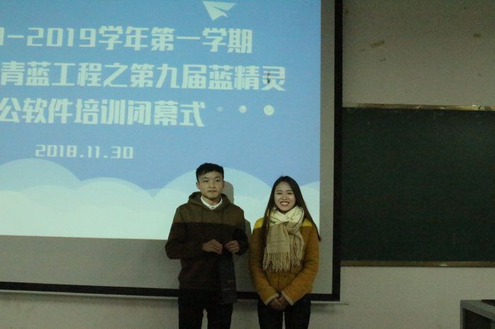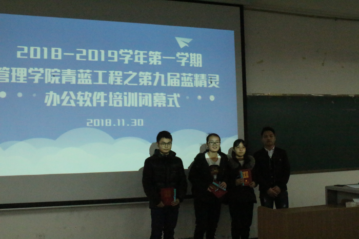 11月30日12:20我院在c114举办青蓝工程之第九届蓝精灵办公软件培训闭幕式。我院学工办主任袁久斌出席,社团联合会信息技术学院分会办公室主任喻孝波受邀参加。我院全体学生干部参与。