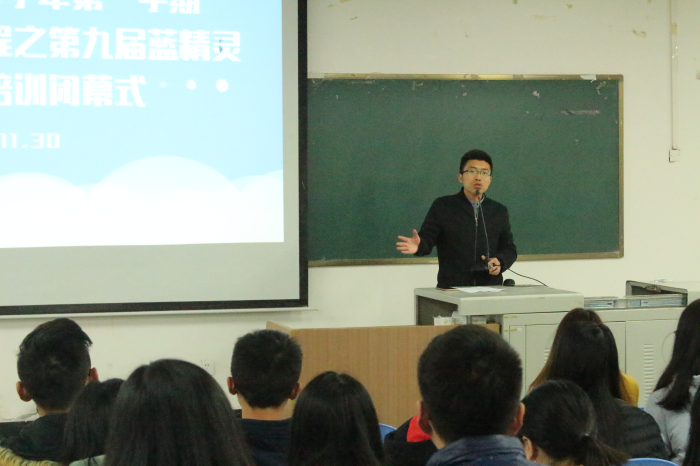 俞孝波上台讲话,他表示很开心能够参与本次蓝精灵培训活动。提出学生干事在工作时首先要有责任意识,才有利于更好的完成学生工作。其次要有目标意识,给自己制定一些小目标并敢于去实践,努力让自己变得更好。他还提到,作为学生干部应考虑整体,顾全大局,为团队的着想。同时发挥自己的主动能动性,为团队出谋划策,不忘初心,方得始终。