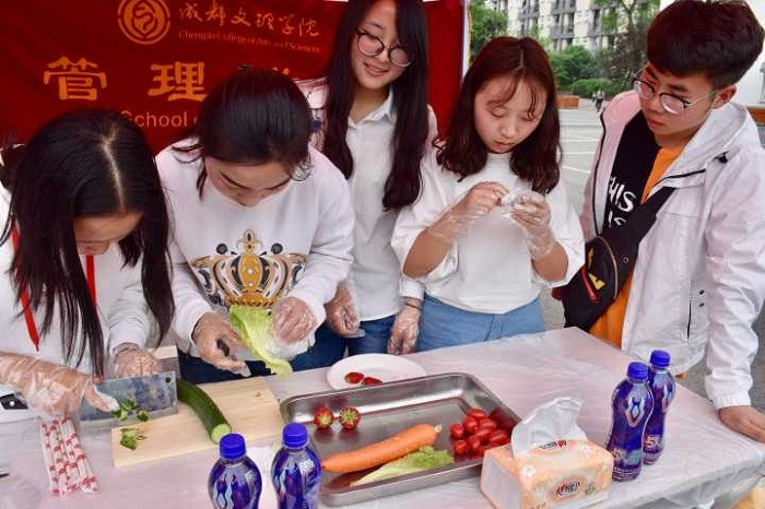 4月12日14时,为增强同学们的团队合作意识,提高同学们的生活技能和动手能力。传媒学院、管理学院和文学院于社团文化广场(润物楼旁)举行了美食节。三个学院各分团委常委近十人担任美食评选评委。