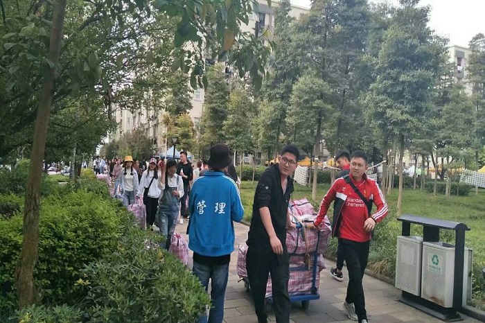 8时许,志愿者们来到指定地点集合并布置场地,为迎接工作做最后的准备。9时许,来自洪河校区的校车抵达。医护学院的同学在志愿者的带领下找到并熟悉自己的寝室。不久,搬运行李的货车顺利抵达,志愿者们连同司机等人卸下所有行李,开始了紧张的搬运工作。医护学院同学认领了自己的行李后,志愿者有序帮助每个同学将行李搬运至对应寝室。