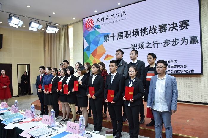 12月1日14:00,为提高当代大学生应聘技巧,增强其心理素质和职场竞争力,成都文理学院校友会和社团联合会管理学院分会联合举办的第十届职场挑战赛于学工部105举行。万达商管集团成都区域金堂万达广场市场推广部经理赵铭、成都邂逅形象设计有限公司市场经理易秋敏、四川麦课麦咖文化传播有限公司运营总监Ada、成都品尚农电子商务有限公司总经理刘丹及管理学院办公室所有老师出席,17级全体同学参加。