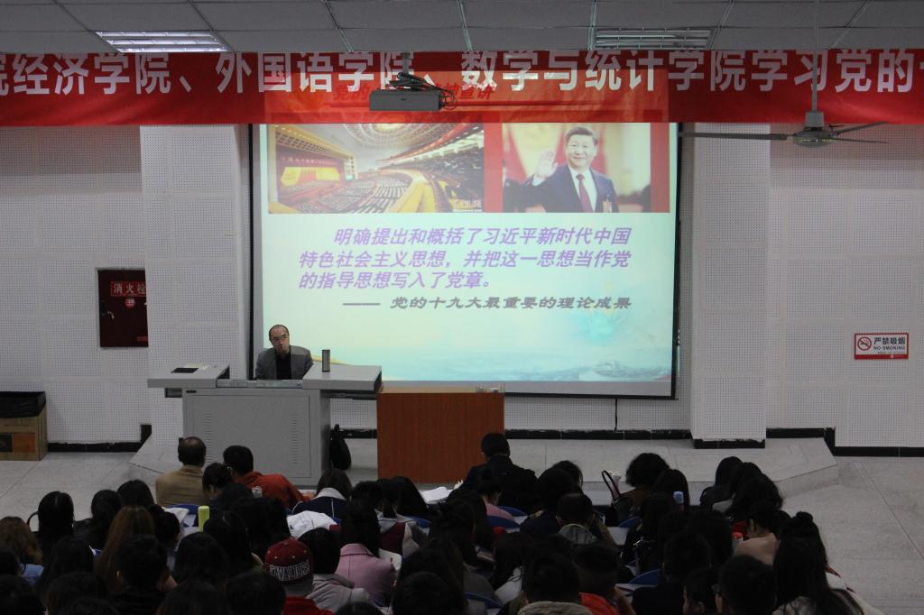 11月16日15:30成都文理学院经济学院、外国语学院、数学与统计学院学习党的十九大精神报告会在二教101正式开始。为了让广大师生充分认识到党的十九大精神宣讲活动的重大意义、兴起学习贯彻十九大精神的热潮,特邀学校党委宣讲团成员、成都文理学院马克思主义理论教研部副主任夏冰副教授宣讲党的十九大精神。外国语学院院长王维民、经济学院院长蒋和胜、经济学院党总支书记李江、经济学院副院长李瑞强、专职教师、辅导员及三个学院学生骨干共同参加学习。