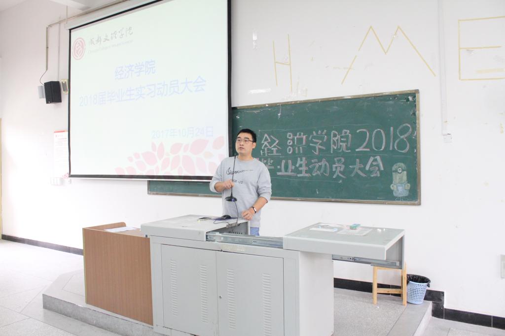 2017年10月24日中午12点30分,经济学院在C214举行毕业生实习动员大会。经济学院党总支书记李江、副院长李瑞强莅临现场,教学秘书余瑶、严君琳,辅导员周子琪及经济学院2018届毕业生参加。