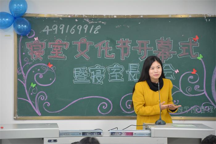 2015年11月12日下午3时,由管理学院自我管理委员会分会主办的第六届寝室文化节开幕仪式暨寝室长大会于B102顺利展开。本次寝室文化节主题为“寝室情,伴我行”。管理学院学工办主任张申华、党支部书记刘新、分团委书记苏燕林到场,自管委所有干事及2015级全体寝室长参与。