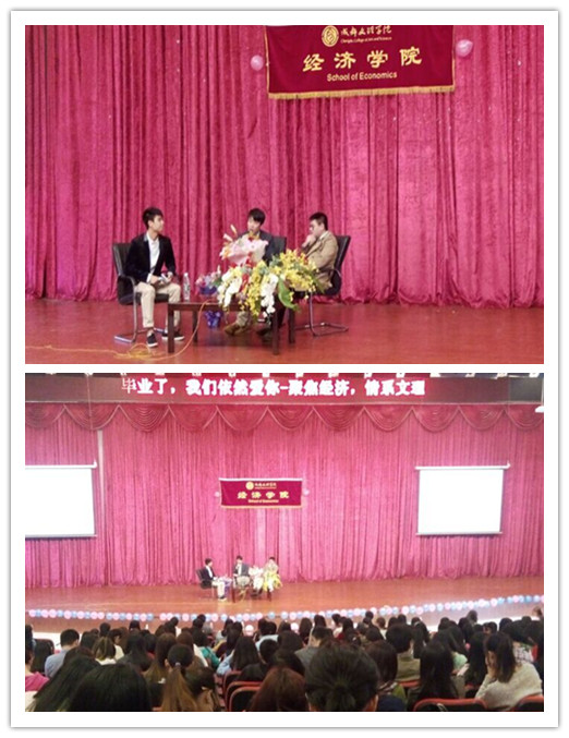 此次回来的经济学院校友是经济学院2009级国际经济与贸易专业的毛河西和谢雨辰。两人在校期间担任多种职位,也多次获得荣誉称号和奖学金,毕业之后凭借自己的努力取得了良好的成绩。两人各自向学弟学妹们讲述了自己的求学经历以及创业历程。毛河西表示,在校期间一定要处理好学习与工作的关系,积极参加各种活动锻炼自己,也要认真学习积累知识为以后工作做准备,当然也需劳逸结合。谢雨辰也告诉学弟学妹们在大学不仅要处理好学习、工作、娱乐的关系,更要注重自我调节、克制和学习,这样才能真正有所收获。而毛河西在讲述自己毕业后的工作时则说:“我因为不能管理好自己的情绪而在工作中出现了很多失误,最后辞职。”接着说道:“希望学弟学妹们能学会管理自己的情绪,遇事不要冲动,冷静思考。”谢雨辰说到,在工作中要认真负责,敢于挑战困难,要把书本知识运用到实践当中,同时还要注重团队协作。在互动环节中,台下的学弟学妹们争先恐后地提问,两位校友也耐心地详细解答。最后,各学院老师再次对两位校友的回来表示欢迎,也希望他们未来能取得更大的成就。