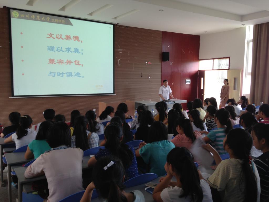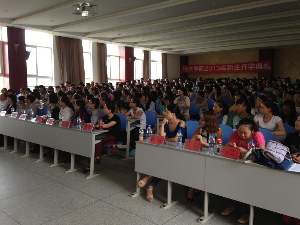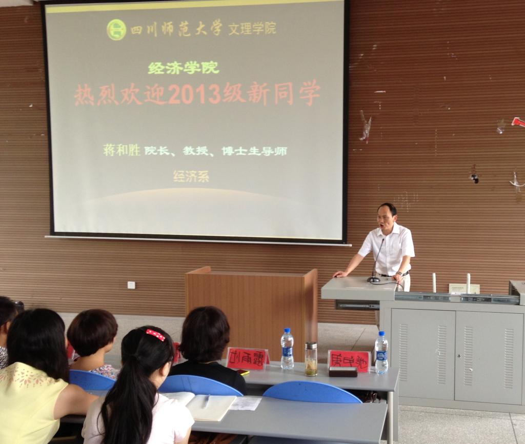 2013年9月17日下午13:00,四川师范大学文理学院经济学院2013级新生开学典礼在二校区教学楼B214教室隆重举行。出席本次开学典礼的领导及嘉宾有经济学院院长蒋和胜、文理学院数学教研室主任喻秉钧、经济学院院长助理万芳、国际经济与商务教研室主任刘胜林、经济与金融教研室主任武晓东、经济学院学工办主任陈丹怡、分团委书记吴操、教学秘书余瑶以及全体专职教师。
