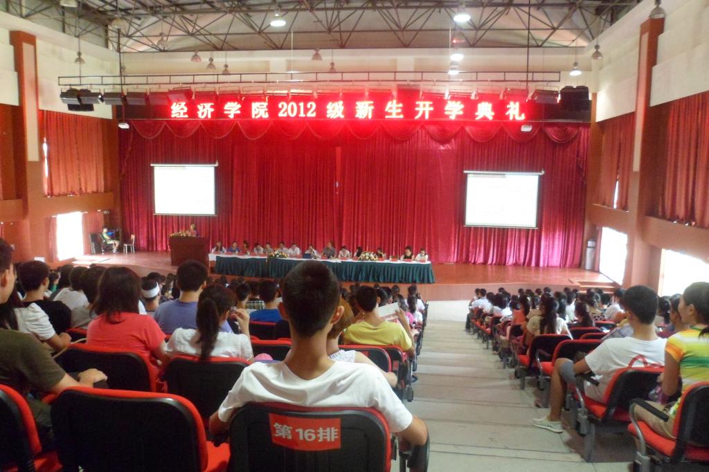 2012年9月11日下午2:30四川师范大学文理学院经济学院在第二校区文理大讲堂里举办了2012级新生开学典礼,出席本次开学典礼的领导及嘉宾有经济学院院长蒋和胜教授、数学教研室主任喻秉均教授、经济学院副院长李瑞强副教授、经济与金融教研室主任武晓东老师、国际经济与商务教研室主任刘胜林老师、经济学院学生办公室主任陈丹怡老师以及其他老师。