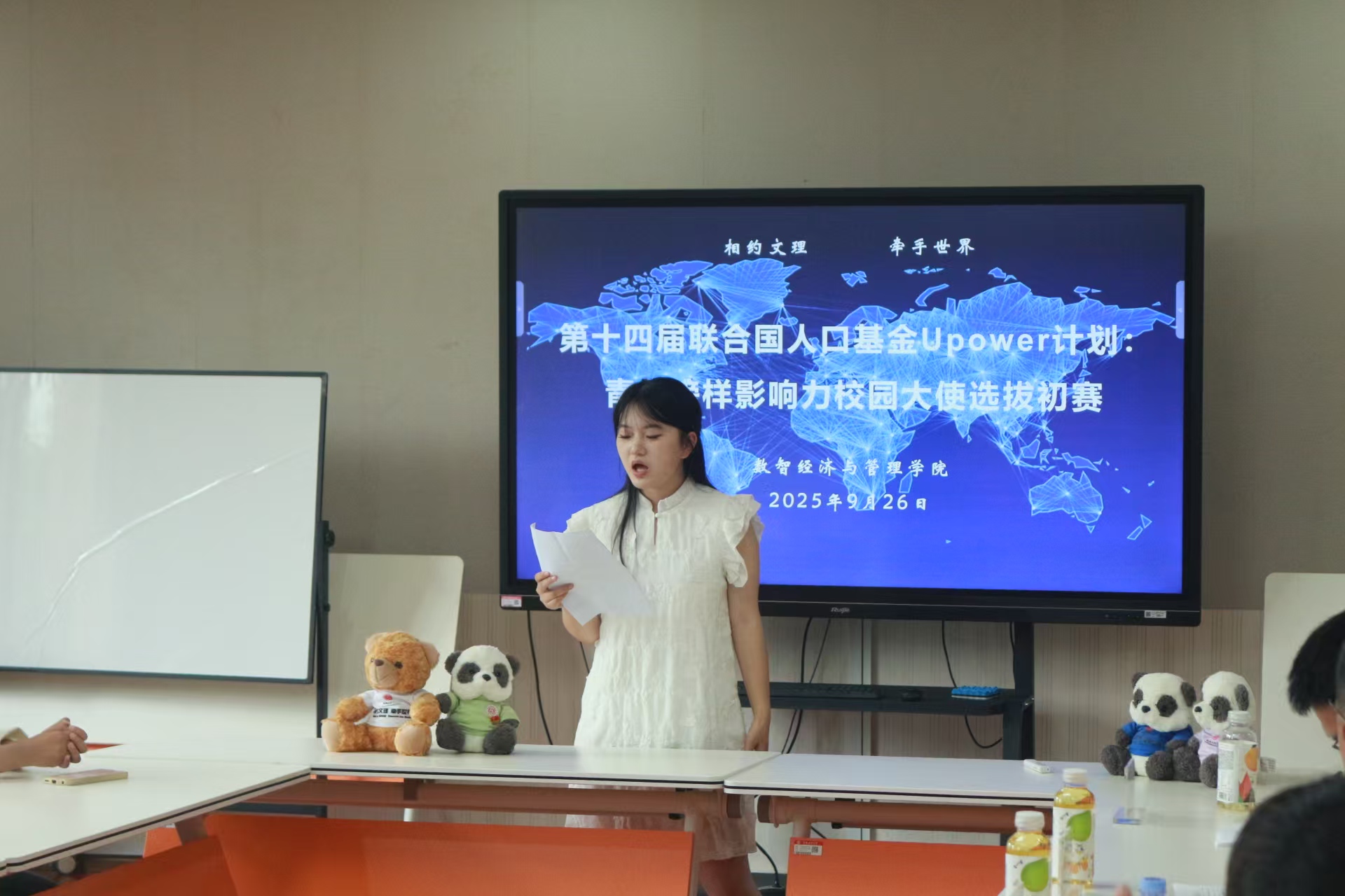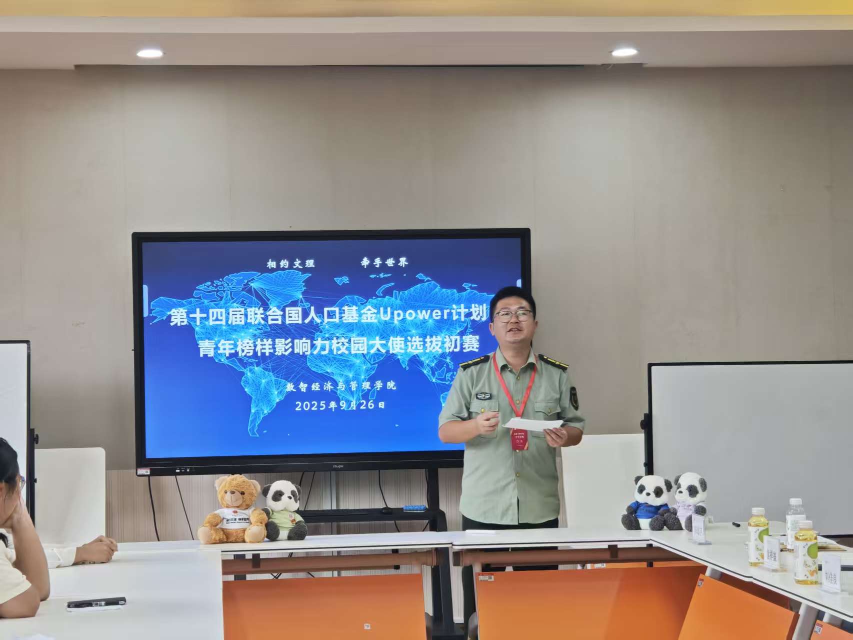 为深入践行“高端化、全球化、个性化”办学理念,对接全球化时代高等教育发展需求,培养具备全球视野与人类情怀的高层次人才,数智经济与管理学院于9月26日上午11时40分,在行政楼A312顺利开展“联合国人口基金UPower计划:第十四届青年榜样影响力培训”校园大使选拔大赛初赛。数智经济与管理学院全体辅导员出席,学院陈思宇、袁祥崟、刘佳良担任评委。