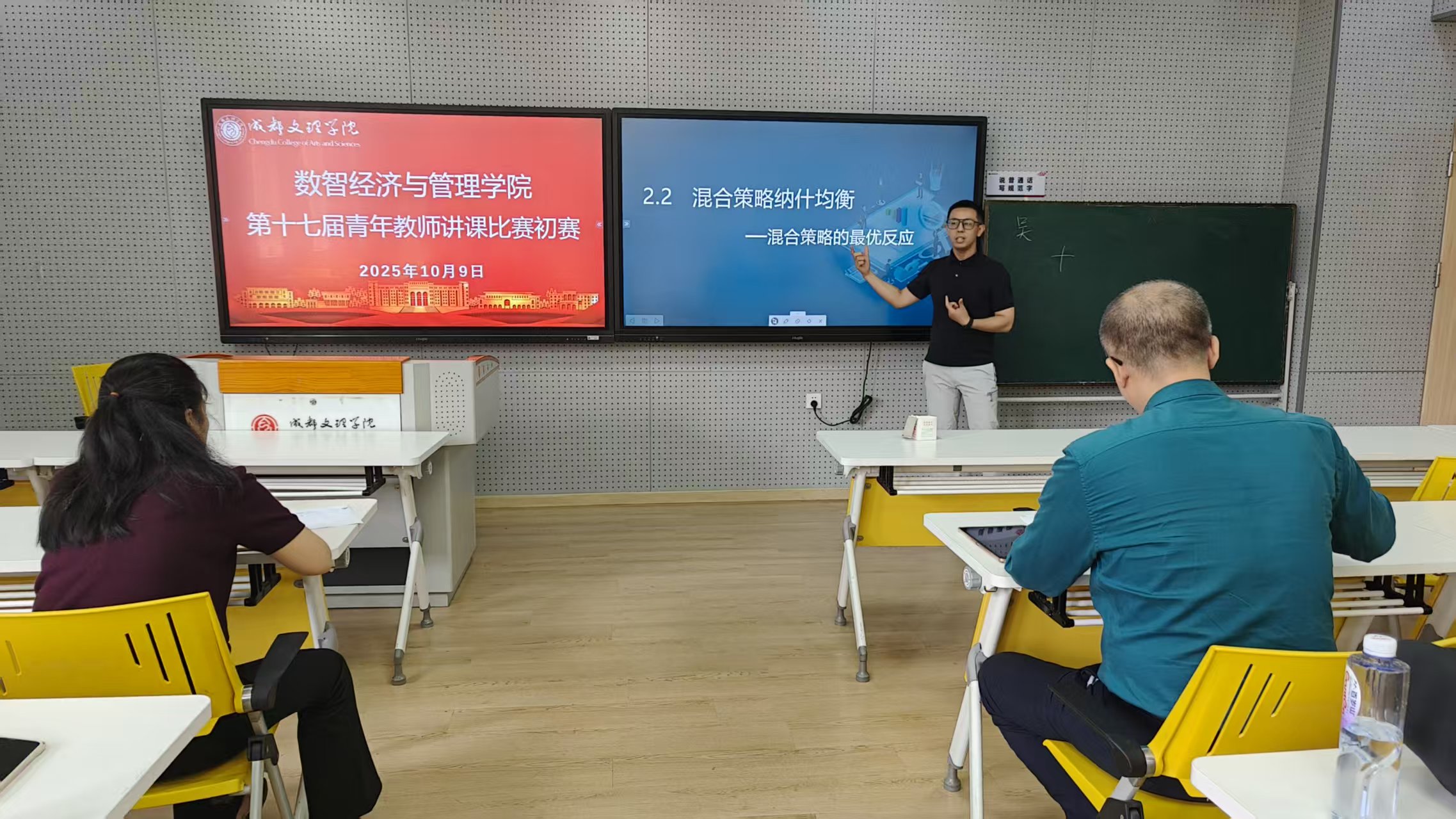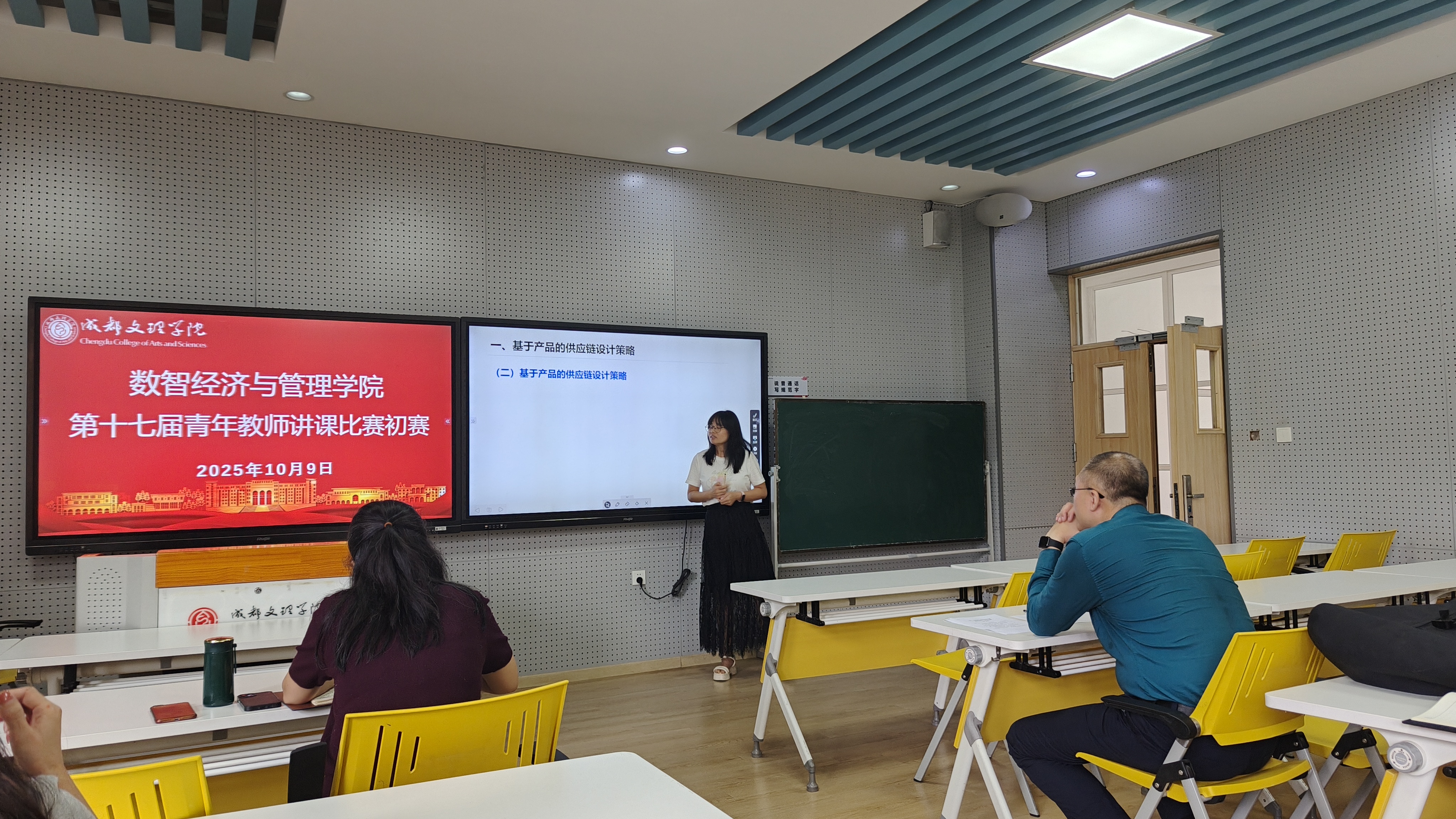 为深入贯彻习近平新时代中国特色社会主义思想和党的二十大精神,积极落实全国教育大会精神及教师队伍建设改革要求,数智经济与管理学院于10月9日下午在C303教室开展了第十七届青年教师讲课比赛初赛。本次比赛旨在选拔出能够代表本院教学水平和师德师风的优秀青年教师参加校级决赛,进一步提升青年教师的教学基本功和创新能力。