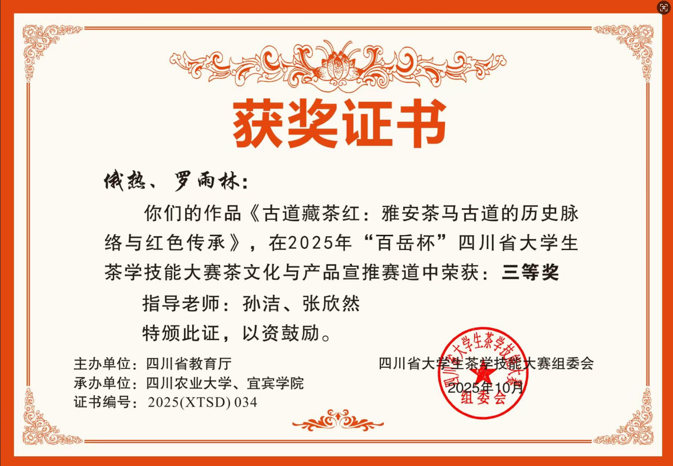 此次获奖,既展现了我院学子在茶文化传播与产品宣推领域的实践能力,也印证了专业教学在理论与实践结合方面的培育成效,为后续人才培养积累了宝贵经验。