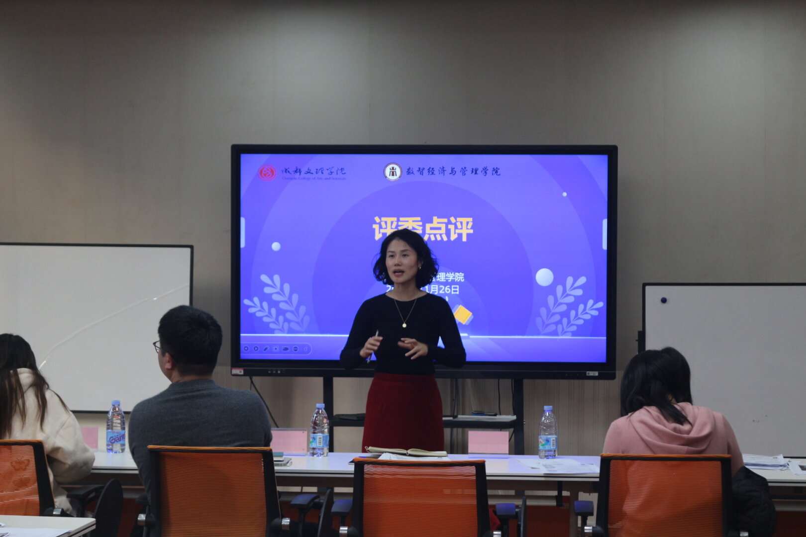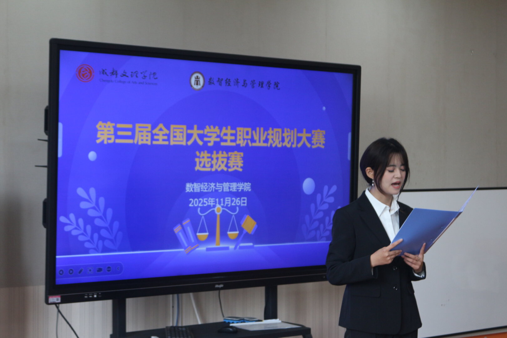 为引导学生树立正确的就业观,科学规划职业生涯,全面提升就业竞争力,数智经济与管理学院于2025年11月26日下午13时30分在教师发展中心成功举办第三届全国大学生职业规划大赛数智经济与管理学院初赛。学院学生第二党支部书记赵钰,学生第三党支部书记阮如玉,学生公寓自我管理委员分会指导老师袁祥崟,艺术团指导老师黄子懿,2025级专升本辅导员胡婷出席本次活动并担任评委。