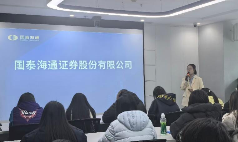 在国泰海通证券,投资顾问梁丹丹与后台主管霍碧莲等热情接待了师生一行,并带领大家参观公司职场环境、介绍企业概况,分享当前宏观经济与金融市场形势。