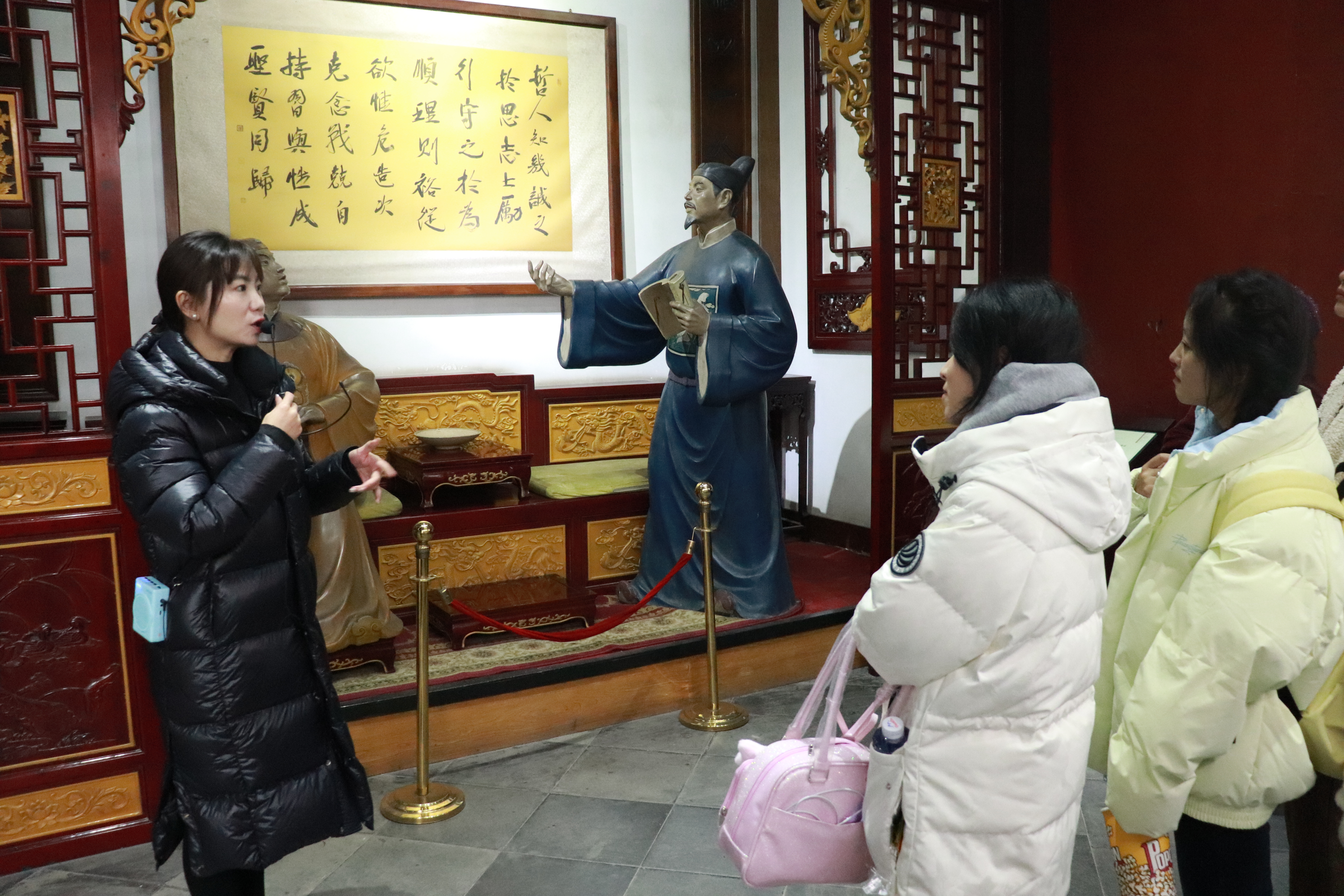 下午,师生一行转至新都区桂湖公园,在明代园林的典雅景致中探寻历史文脉。在杨升庵故里,大家详细了解了明代状元杨慎的生平事迹、文学成就与治学精神,重点学习了其“临利不敢先人,见义不敢后身”的品格风范。参访过程中,各小组围绕“文化传承与创新”主题展开热烈讨论,从管理学的视角探讨传统文化资源的活化路径与品牌价值构建。
